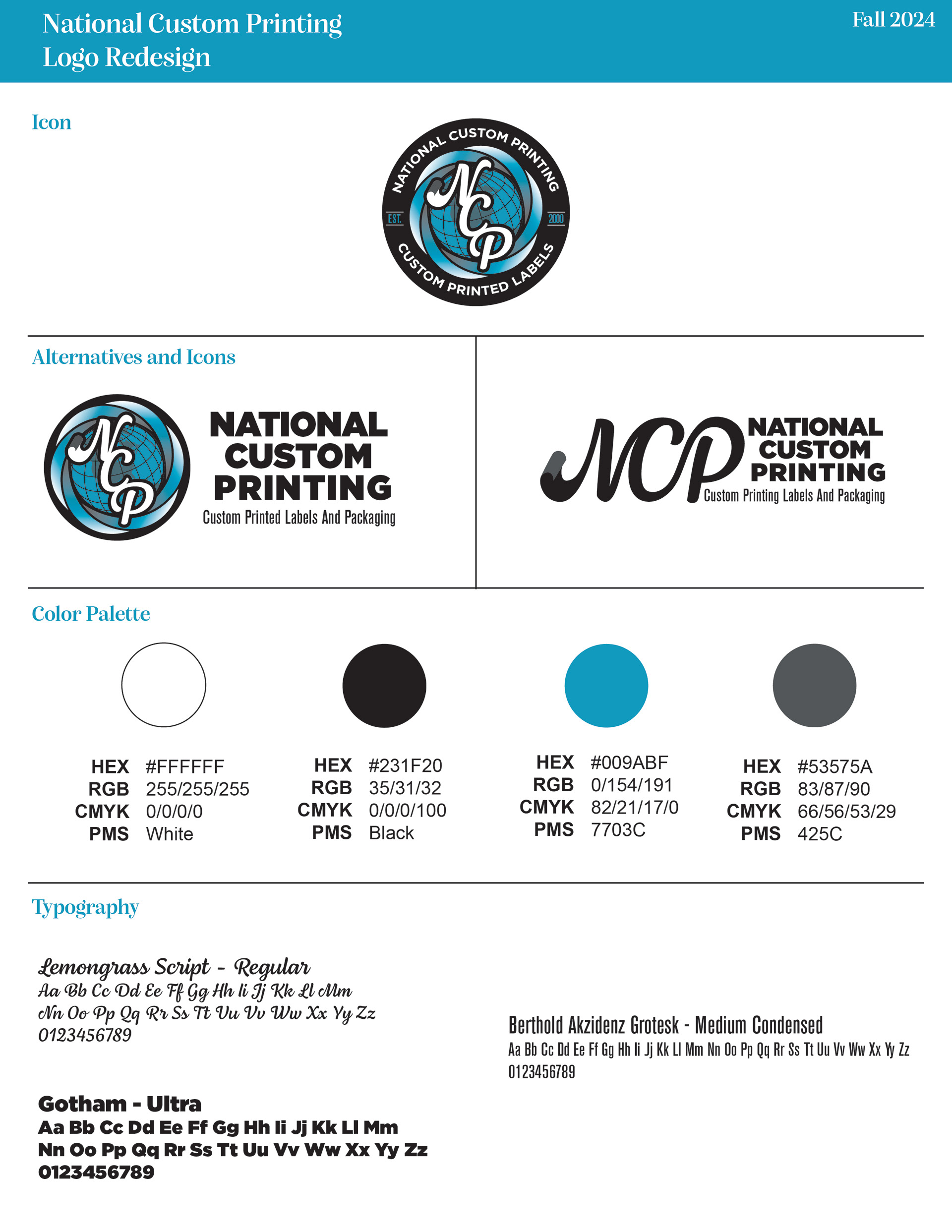 National Custom Printing is a label printing and packaging company that offers both flexographic and digital printing. Client requested a new, updated logo that was reminiscent of the original by keeping the globe aspect. Client also requested that letters ‘NCP’ be at the forefront and interconnected of the redesigned logo.